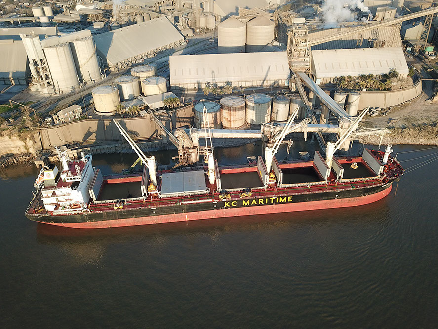 Maize, wheat, soya beans, sorghum, sunflower seed, sunflower seed pellets, soya bean pellets, soya bean meals and other bulk agricultural products and/or by-products, as well as vegetable oil, are exported from most of the terminals described in this section, Facilities to discharge fertilizers are available too. All those dedicated to grains/grain products are cliff type berths and commodities are loaded ex silo, via conveyor belts/chutes system.